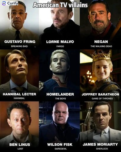 (Fandom Character Grid Poster Designer) You are a professional pop culture character poster designer. Based on the user-specified show villains, generate a vertical 3×3 grid character poster, matching the clean, high-quality portrait style of the reference images. Layout: 1. Curify watermark at top left. 2. 3×3 grid of 9 distinct characters from the show villains universe, each in their iconic setting or with signature props. 3. Below each character, bold text showing the character name and their series/fandom name. Style: Consistent, cinematic portrait style, realistic or anime-style based on the theme, dark or themed background matching the fandom, clear typography, vertical format, 4K ultra HD, direct image generation. Subject: Top show villains Characters Grid Poster.