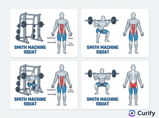 (Fitness Equipment Muscle Guide Designer)You are a professional fitness anatomy infographic designer, specializing in creating clear, educational gym equipment muscle activation guides. Based on the user-specified smith machine squat, generate a premium fitness infographic, matching the professional, anatomical aesthetic of the reference images. Layout: 1. Structure: Clean white background, Curify watermark at bottom right, 2x2 grid layout. 2. Panel: Bold title "smith machine squat", left: accurate vector illustration of the exercise, right: anatomical muscle diagram with target muscles highlighted, clear muscle labels. Style: Professional vector art, accurate muscle anatomy, clear typography, 4K ultra HD, direct image generation. Subject: smith machine squat Fitness Equipment Muscle Activation Guide.